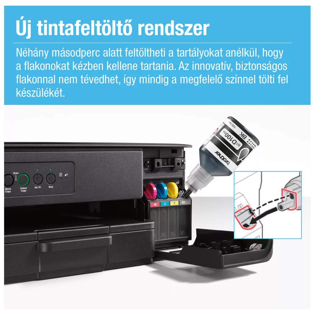 **SZÍNES, A4, WIFIS, KÜLSŐ TINTATARTÁLYOS, SIMATETŐS, FEKETE SZÍNŰ MULTIFUNKCIÓS NYOMTATÓ!** *Nyomtatás: 16 kép/perc *A4 *Nyomtatás: 1200×6000 dpi; Másolás 1200x1800dpi; Síkágyas szkennelés: 1200x2400 dpi (optikai) és 19200x19200 dpi (interpolált) *128MB RAM *2.4GHz és 5GHz WiFi *USB 2.0 *150 lapos lapadagoló *INK TANK REFILL (extra alacsony oldalköltség) *Kezdőtinta 7.500 mono és 5.000 színes oldalra *Kellékei: Fekete: BTD100BK kb. 7.500 oldal (ISO); C/M/Y: BTD100 C/M/Y - Kb. 5.000 oldal (ISO) *2 év garancia (+1 év regisztrációval a Brother Online rendszerében a vásárlástól számított 60 napon belül: https://atyourside.brother.hu/register-your-device)