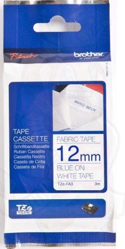 **TZe -FA3 vasalható szövetszalag** * Szalag szélessége: 12 mm * Szalag hossza: 3 m * Szalag színe: Fehér * Felirat színe: Kék