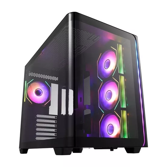 Az FSP M580 egy igazán látványos és praktikus gamer gépház, ami lekerekített formáival és 270°-os panoráma üvegoldalával nemcsak dizájnban emelkedik ki, hanem a lehetőségeid előtt is teljesen új távlatokat nyit. Három oldalra szerelt, fordított ARGB ventilátor és egy hátsó PWM ARGB ventilátor gondoskodik a lenyűgöző világítási effektekről és a hatékony hűtésről, miközben a ház ATX, M-ATX vagy Mini-ITX alaplapokat, akár 445 mm-es videokártyát és 360 mm-es radiátort is befogad. Bőséges tárhelyet kapsz három SSD-vel és két HDD-vel, a Type-C és dupla USB3.0 port pedig gyors csatlakozást biztosít, így a dizájn és a funkcionalitás tökéletesen találkozik ebben a prémium gépházban.