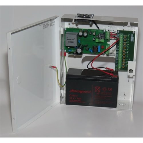 Makrai kapcsoló üzemű CCTV kamera tápegység, szünetmentes üzemmód, 10A, 10 kimenet, akkumulátorhely (12V/7Ah)