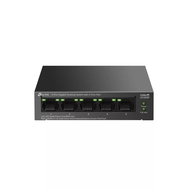 TP-LINK PoE Switch 5x1000Mbps (4xPOE+) Fémházas Asztali, LS105GP